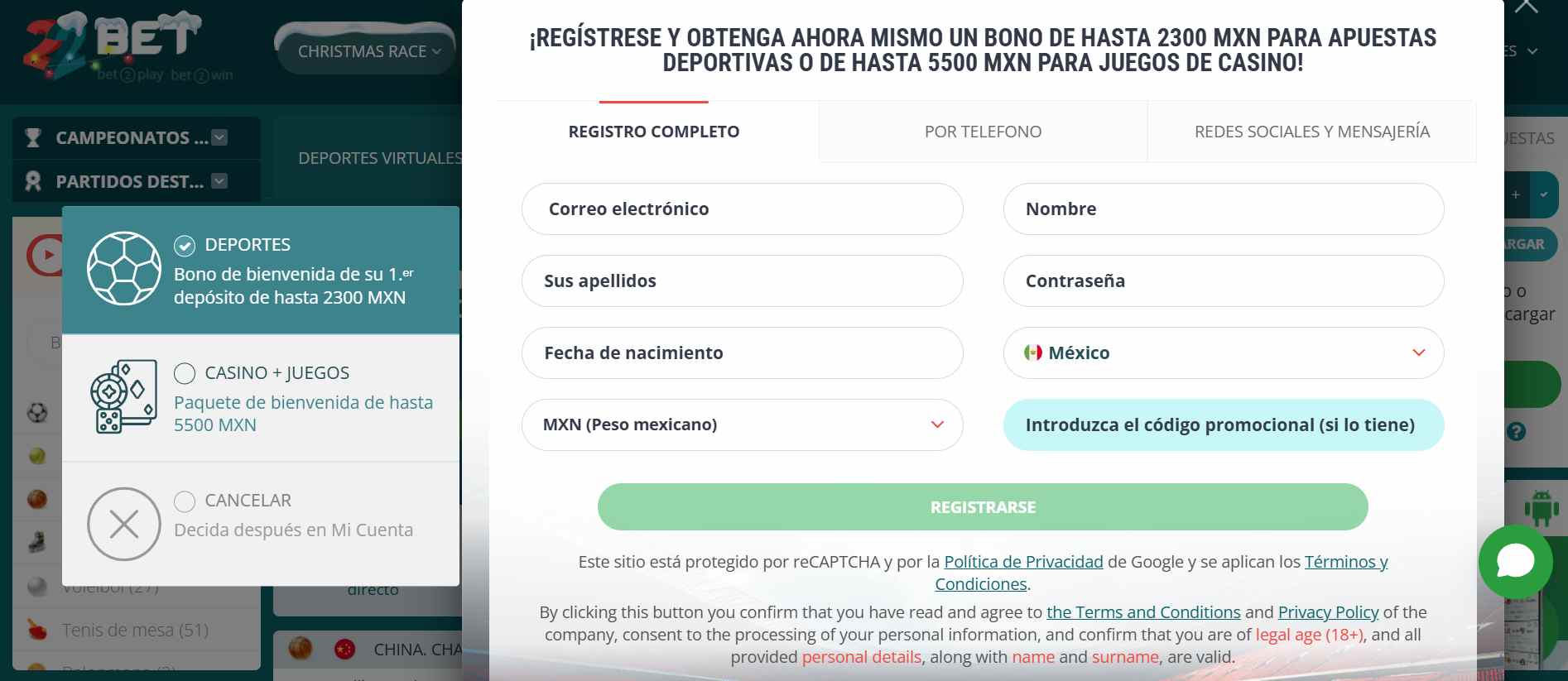 22Bet premia tu ingreso con un bono de bienvenida del 100% hasta 2300 MXN. Para reclamar este fabuloso bono de bienvenida, debes realizar un depósito mínimo de 20 MXN y el bono se activará automáticamente a tus fondos del sitio. Sin embargo, este bono está sujeto a ciertas condiciones como requisito de apuesta de x5 veces el importe del bono en apuestas combinadas. Además, debes un plazo de apuesta de 7 días, de no ser así, el bono caducará.