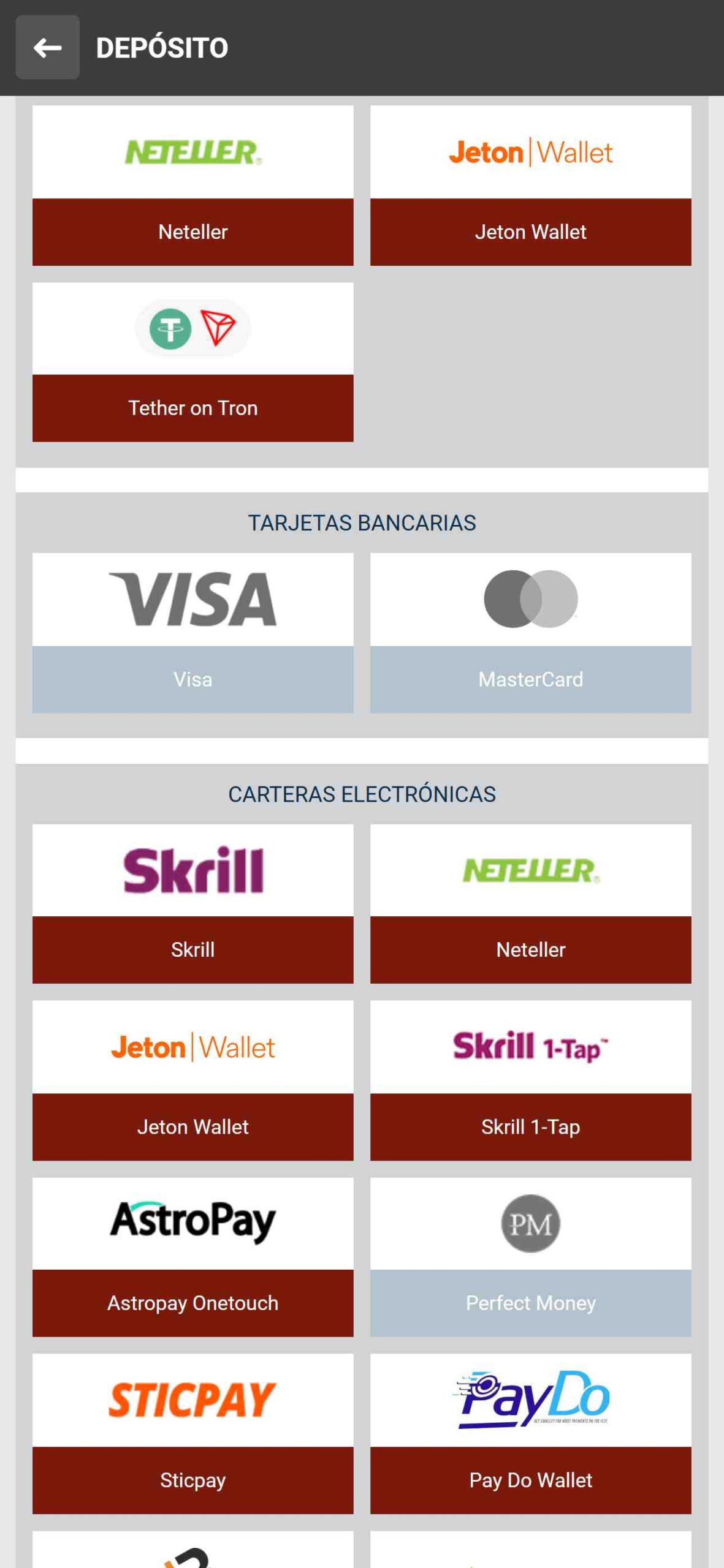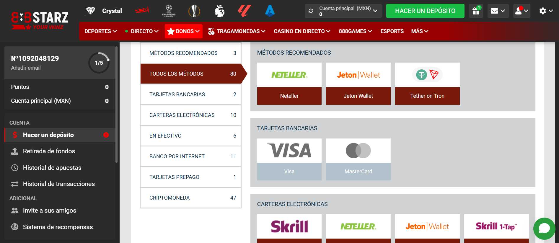 Para disfrutar de las apuestas deportivas 888starz, es indispensable contar con fondos en la cuenta de esta plataforma y para hacerlos llegar debemos utilizar métodos seguros y confiables. 888Starz ofrece una buena variedad, con más de 80 opciones, entre ellas las criptomonedas y otros métodos de pago populares en México. Veamos los más recomendados por el sitio en la siguiente tabla: