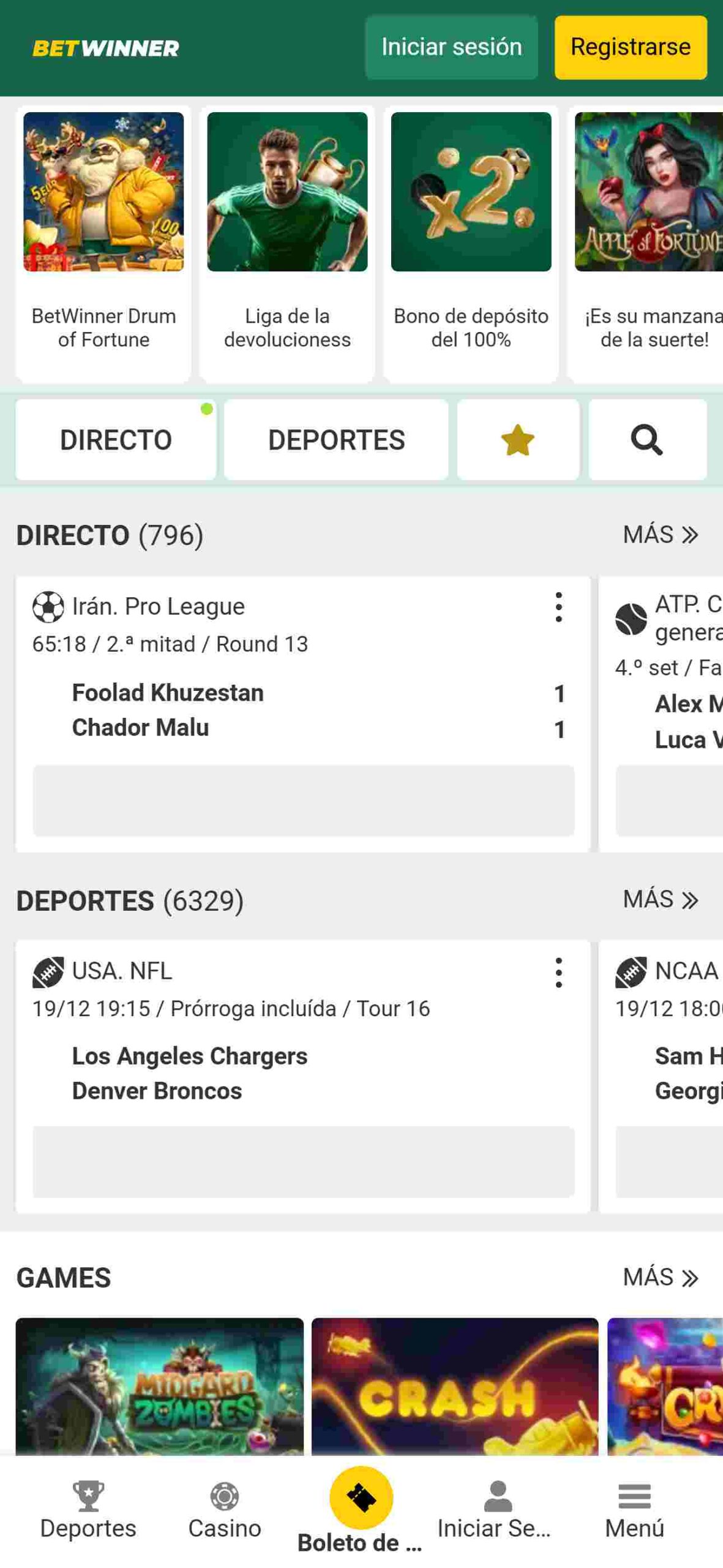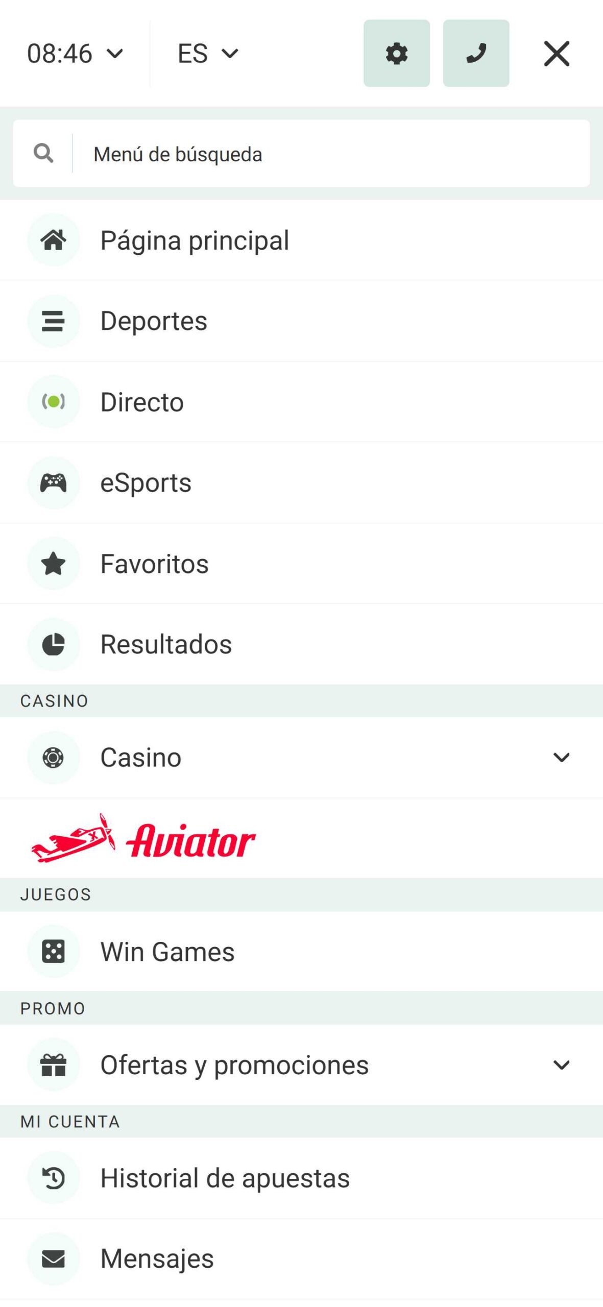 En la parte superior de la página podemos hallar las secciones de interés como los deportes y en directo, pero también está la opción de “MÁS” donde podrás encontrar las secciones de PROMOS, virtuales, y otros. En la misma hilera tendrás tu perfil, ajustes del sitio web para adaptarlo a tu manera y los mensajes.