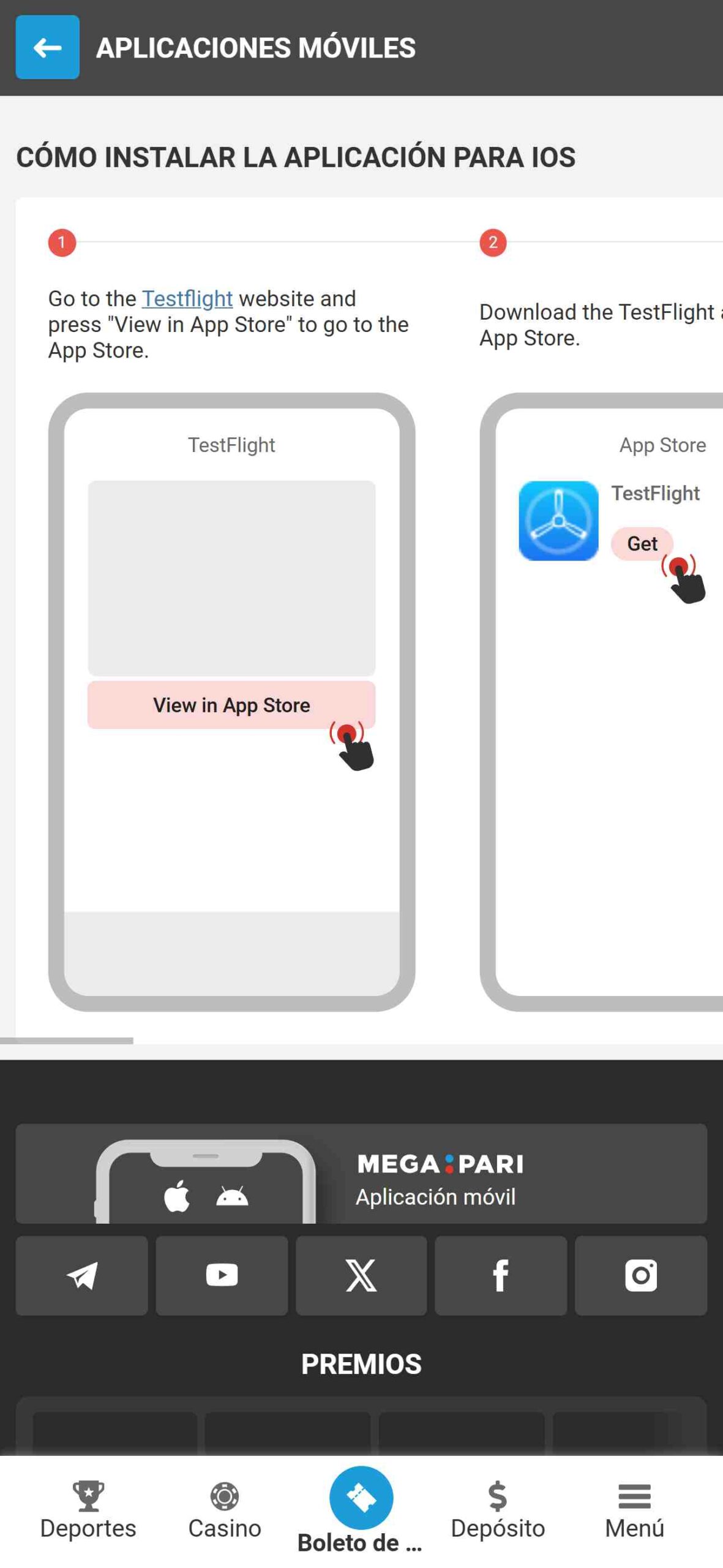 Para la descarga, ingresa a la página principal de Megapari y en la barra derecha del sitio encontrará las opciones de app. Seleccione el tipo de dispositivo y escanee el código QR para iniciar la descarga.