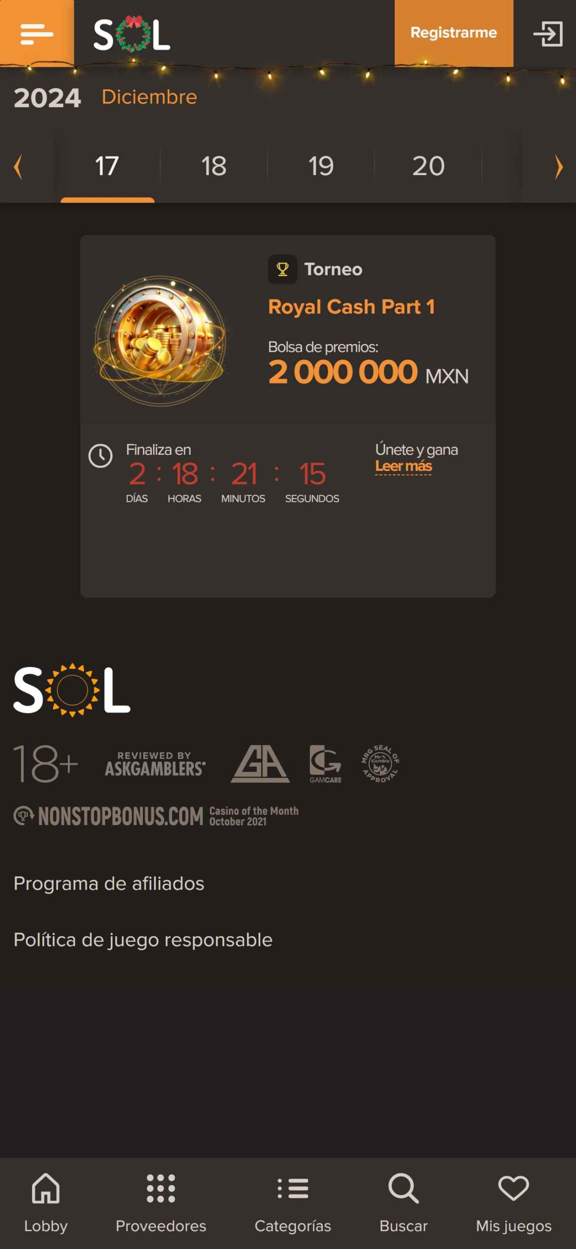Sol Casino se maneja con un diseño en tonos oscuros y colores como naranja, blanco y en las imágenes doradas. Esto atrapa la atención de manera inmediata, ganándose toda la atención del usuario. En cuanto a la interfaz, podemos decir que es fácil e intuitiva.