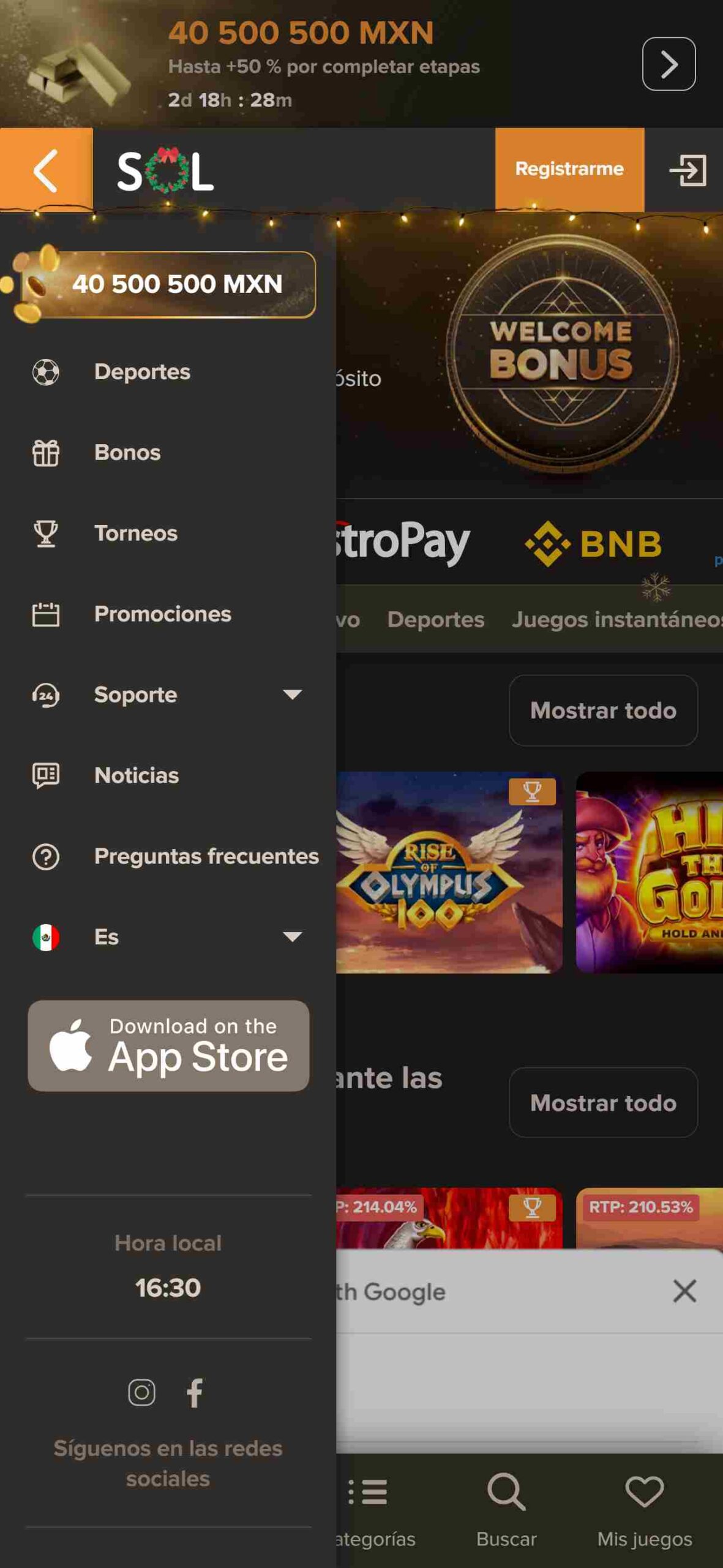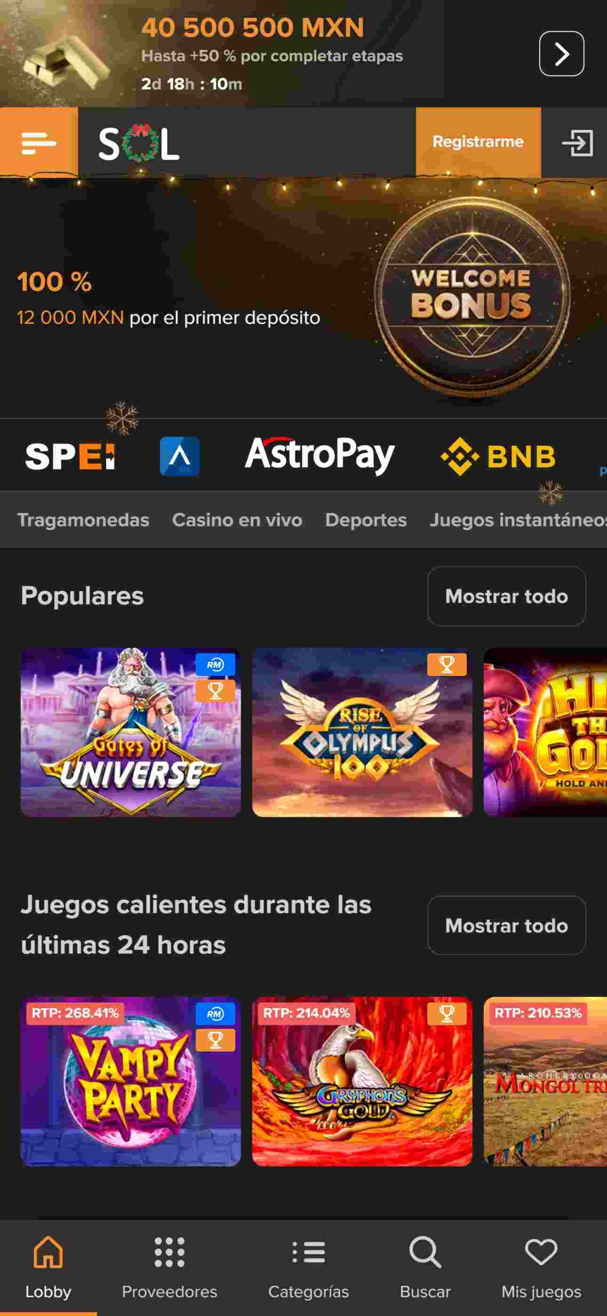 Más allá de ofrecer apuestas deportivas, Sol Casino no se llama así por nada. El sitio también se encarga de llevar los mejores juegos de tragaperras, juegos de mesas y en vivo a aquellos entusiastas de los casinos online en México. Y no solo eso, sino que lo hace de las mano con los mejores proveedores del mercado tales como Pragmatic Play, Play’n’ Go, Evolution, Playtech y más. No te pierdas la diversión de ganar increíbles premios mientras te entretienes con sus más de 1500 juegos.